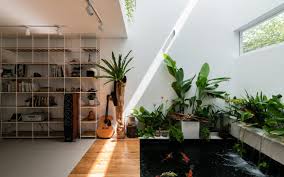Desain kolam ikan depan rumah yang dipenuhi dengan tanaman air yang bisa memberikan pasokan oksigen bagi ikan. Kolam ikan memiliki jembatan kayu di bagian atasnya yang bersambung ke teras kayu dengan kursi taman yang nyaman. Saat ini keberadaan kolam ikan minimalis bukan hanya dijadikan sebagai media dalam menciptakan sebuah hunian yang sangat asri saja. Manfaatkanlah area yang tak terpakai di dalam rumah, misalnya di bawah tangga. Membangun kolam ikan di dalam rumah bukanlah yang tidak mungkin.